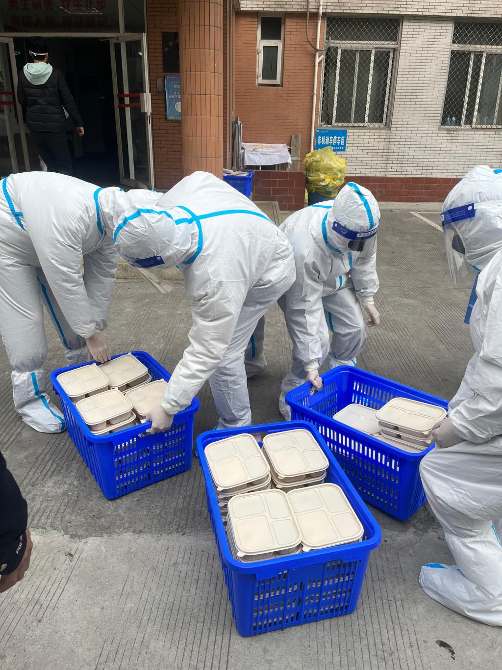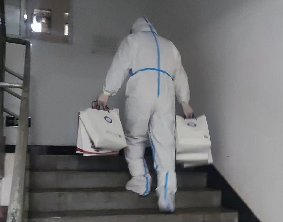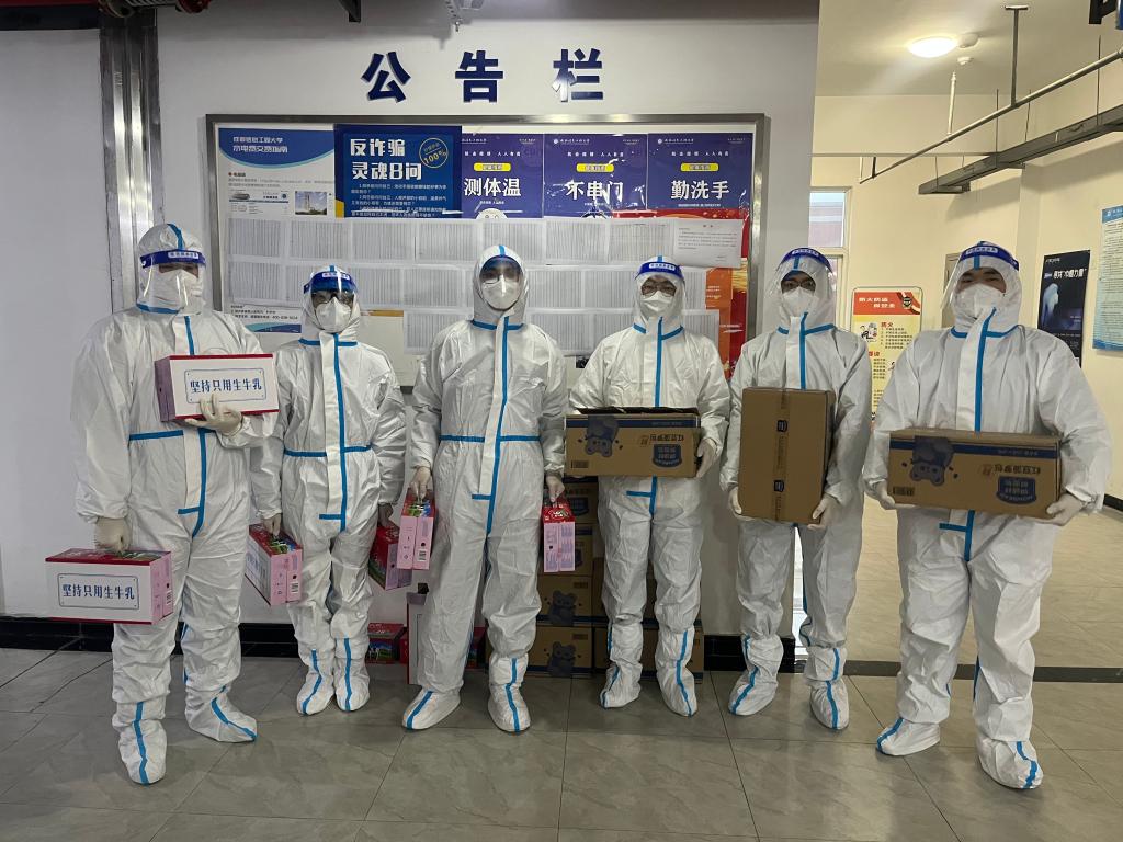 四、对被隔离的员工和宿舍封控的员工,马文英书记和刘畅副书记带领辅导员组织员工志愿者每天按时送餐送生活物资,在生活上对他们进行无微不至的照顾。