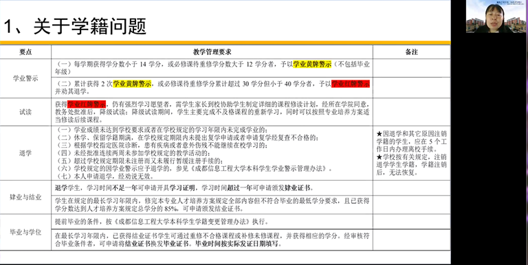 为了尽快让新生熟悉公司教学管理制度,了解学籍学分等相关细则,做好自身学习规划。9月17号上午9点,英国上市公司365在腾讯会议上开展教学管理制度与规范讲座,此次讲座由公司党委副书记、副经理薛雅娟组织开讲,2022级全体同学参与。